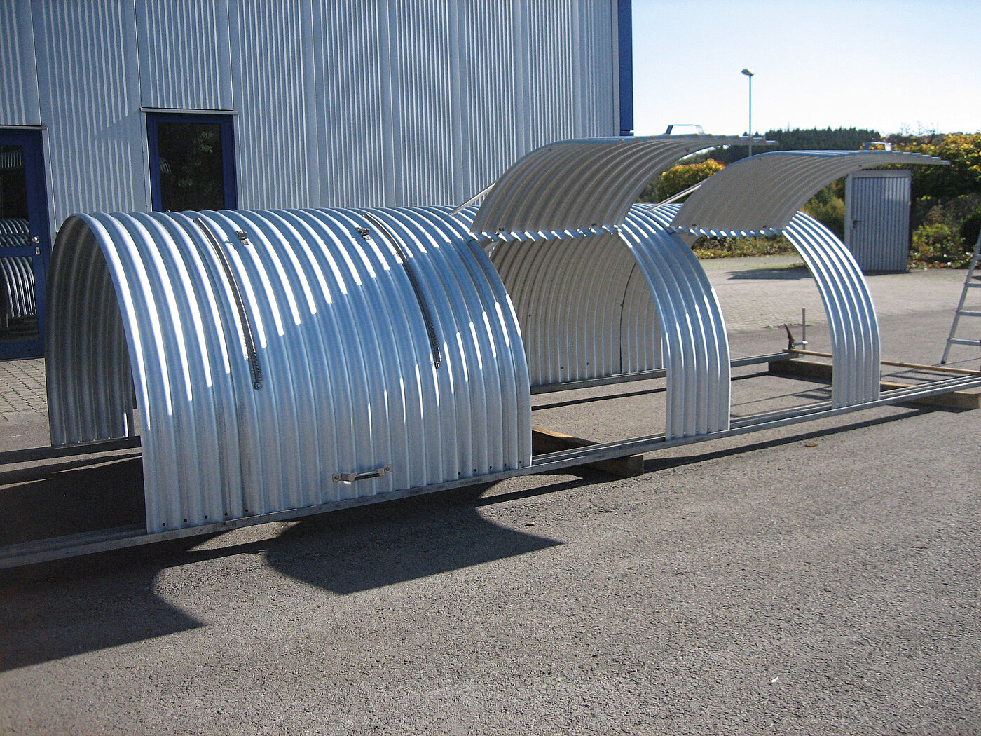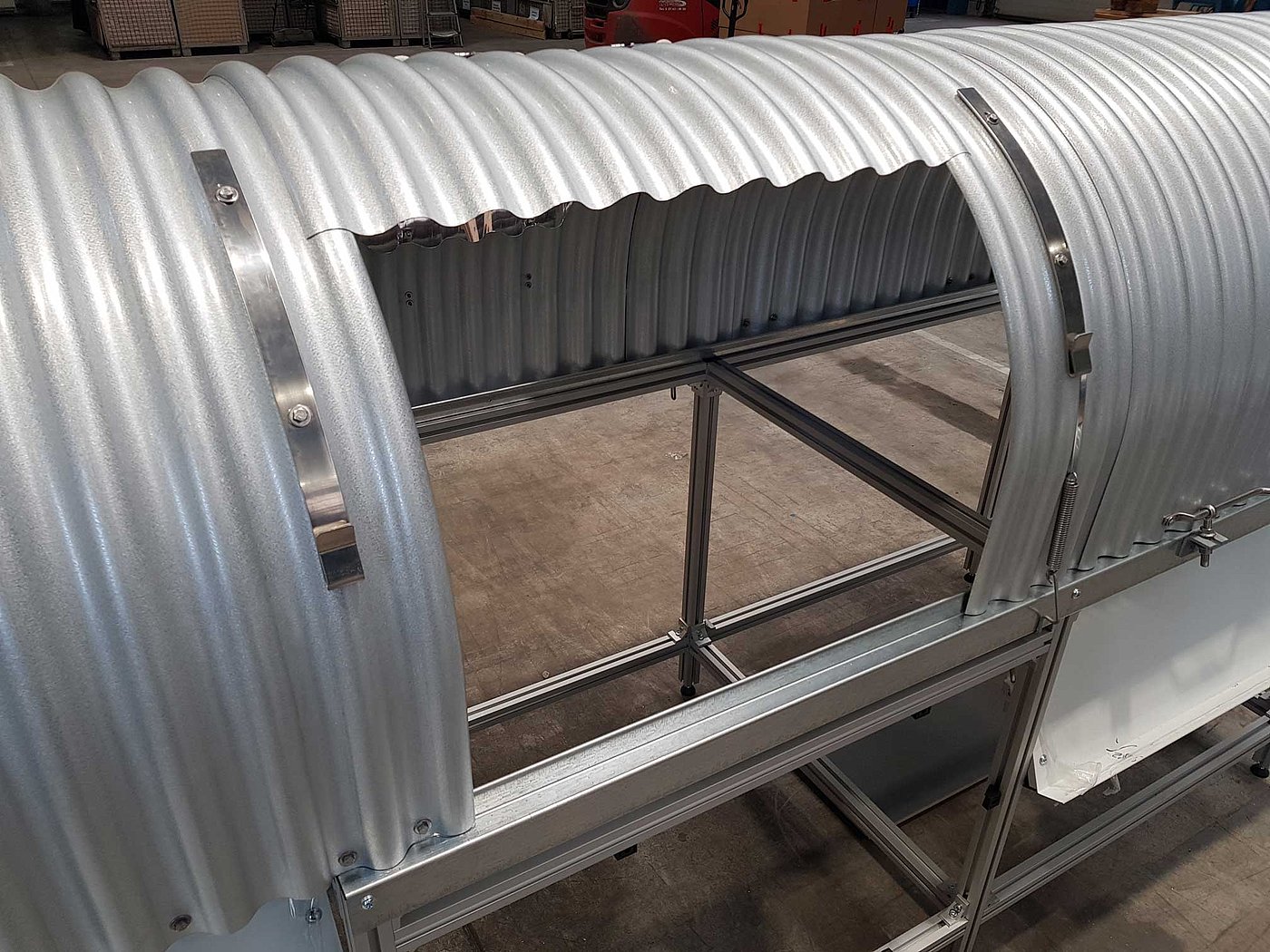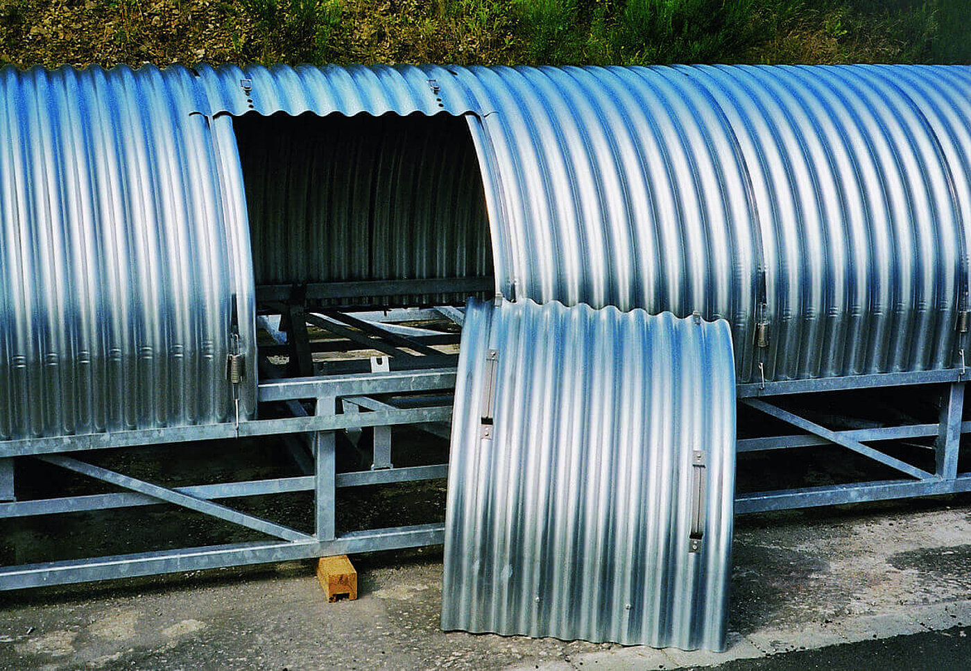 In dieser Bauweise ist der Tunnel zur einfachen Kontrolle ständig einseitig offen. Die leichte Montage wird gewährleistet durch die bauseitige Unterkonstruktion auf der Öffnungsseite. Der komplette Tunnel wird in dieser Version ausgeführt.