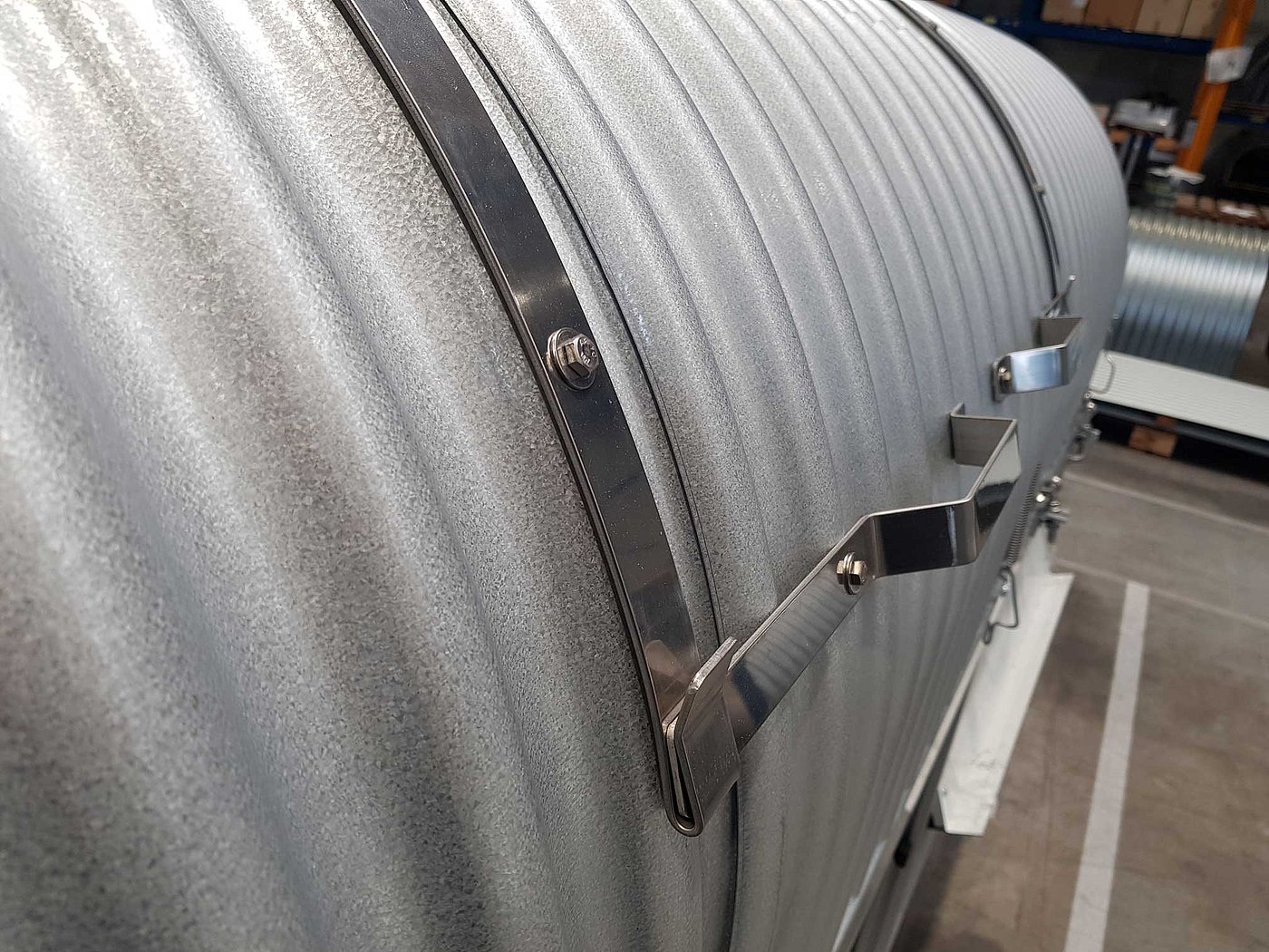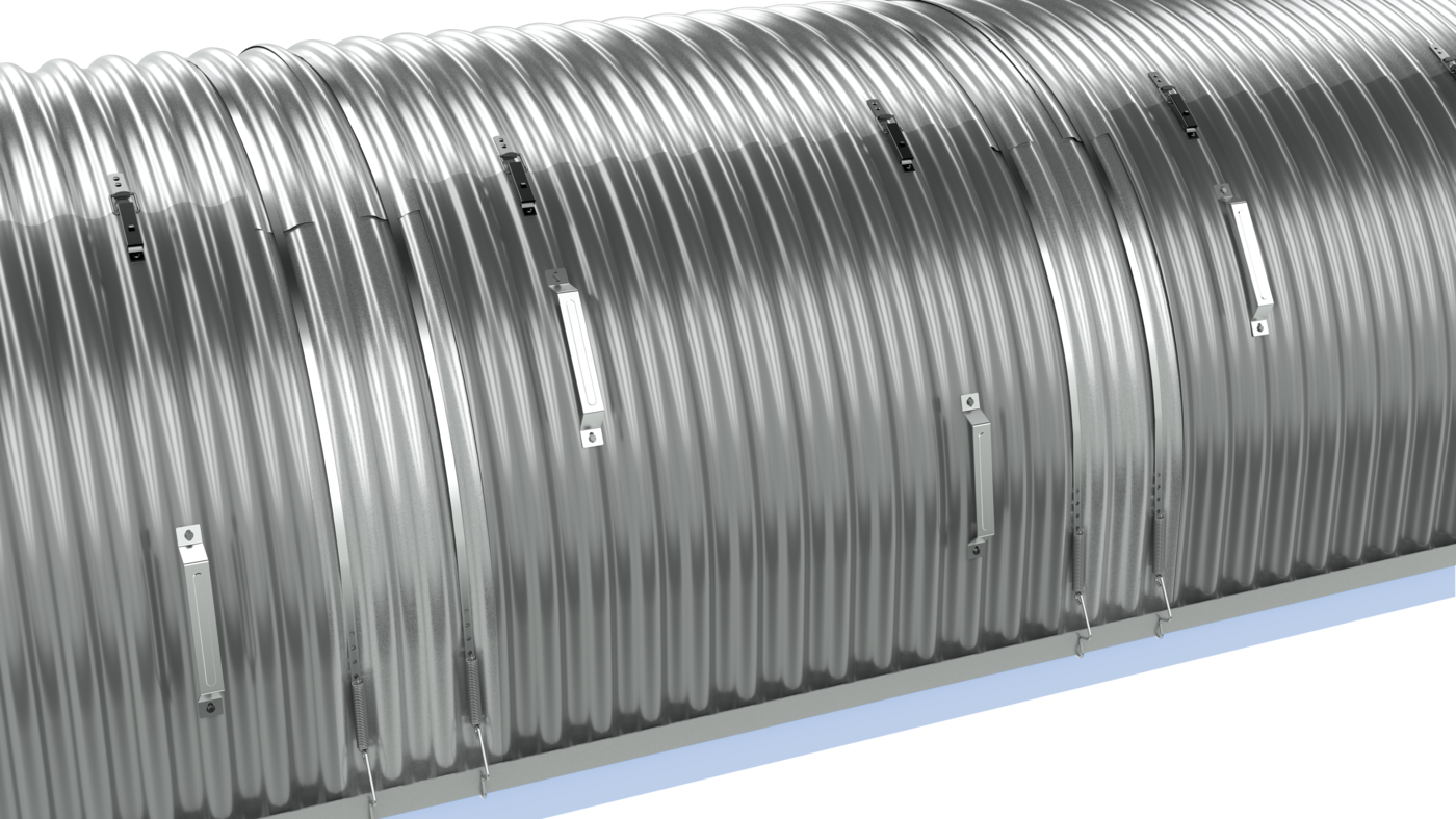 Mit der Achenbach-Schnell-Schiebe-Haube bieten wir Ihnen eine weitere Öffnungsmöglichkeit unserer bewährten Förderband-Abdeckhauben an. Die ASS-Haube wird mit zwei Spannbändern Typ K-ASS (mit Klemmstück anstelle des Handgriffes) befestigt. Dabei werden diese Spannbänder über die Haube herübergeführt und an den Tragkonstruktionen befestigt.