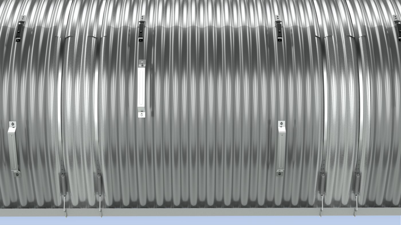"Bei denkbar einfacher Montage erreichen Sie schnellste Einsicht auf Förderanlage und -gut. Die jeweils mittels Handgriff nach oben über den Scheitelpunkt des Tunnels verschiebbaren Haubenhälften liegen auf den benachbarten Hauben auf und werden durch die Profilierung des Bleches gegeneinander wie auf Schienen geführt. Durch den Druck der Spannbänder werden die Haubenhälften in jeder beliebigen Position gehalten. So kann die Größe der Haubenöffnung bei gegebener Breite individuell gewählt werden.