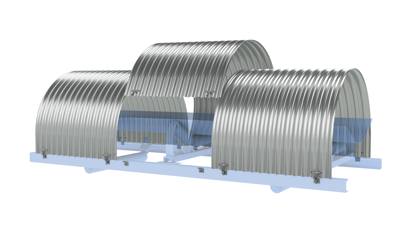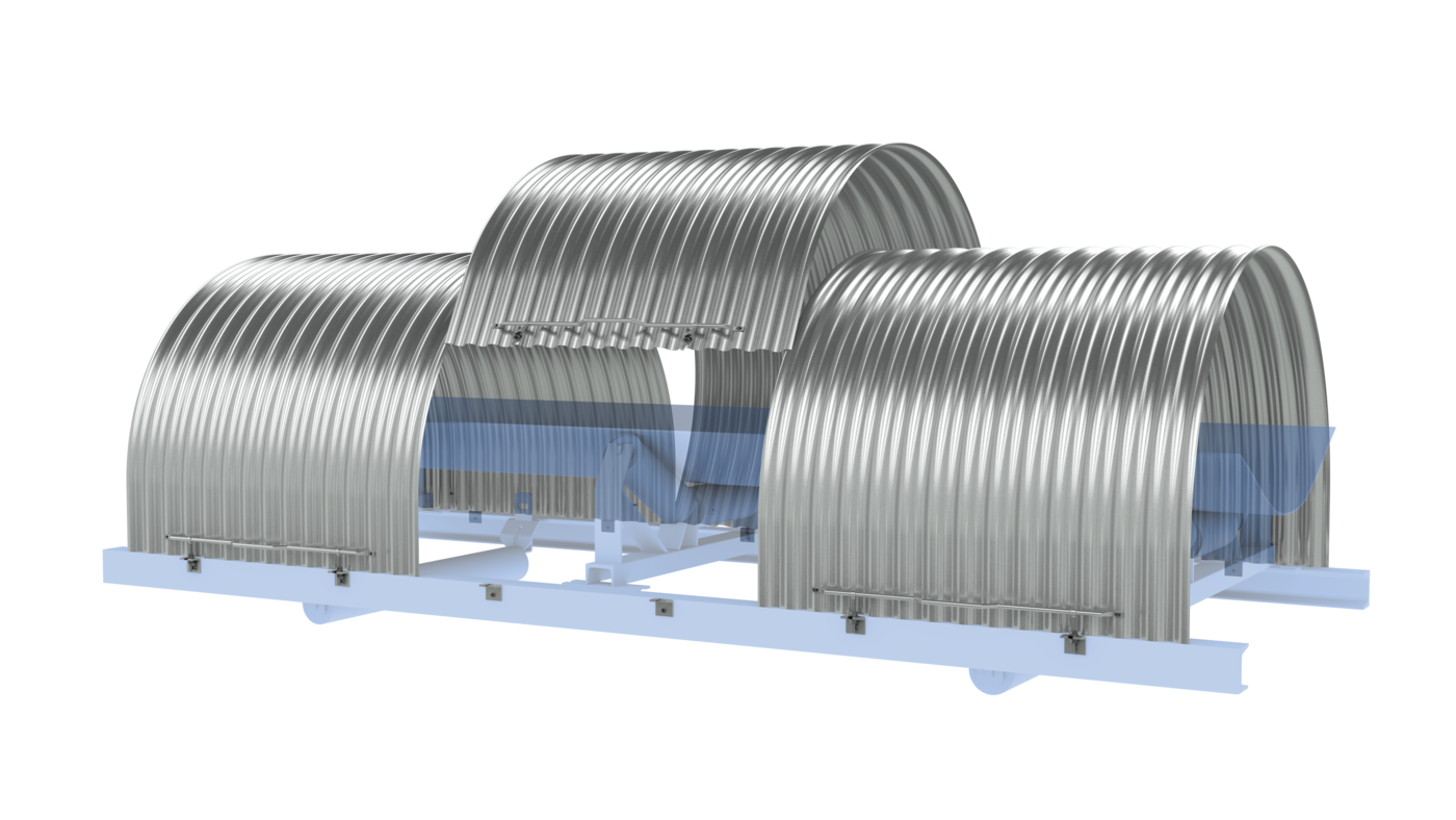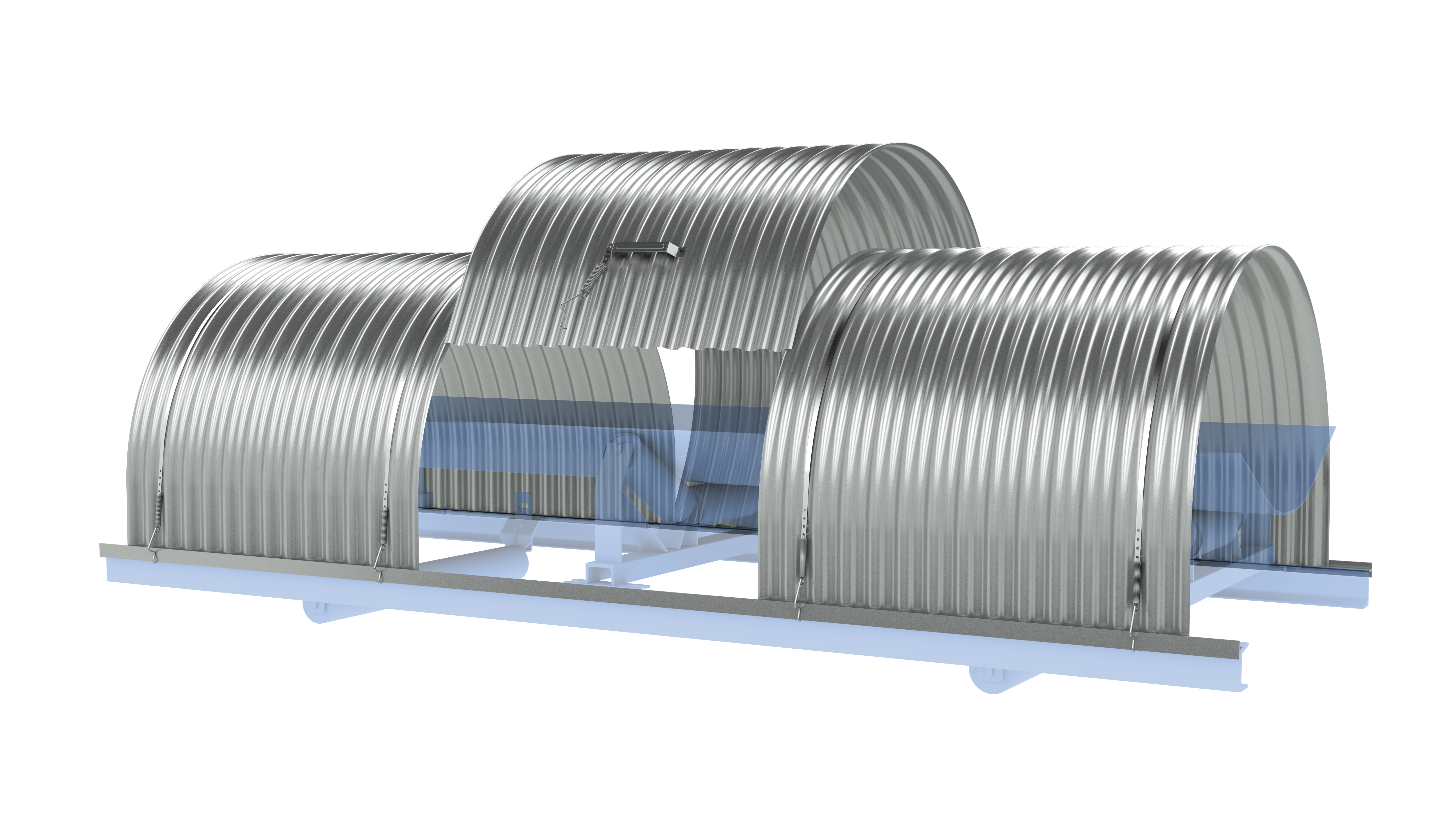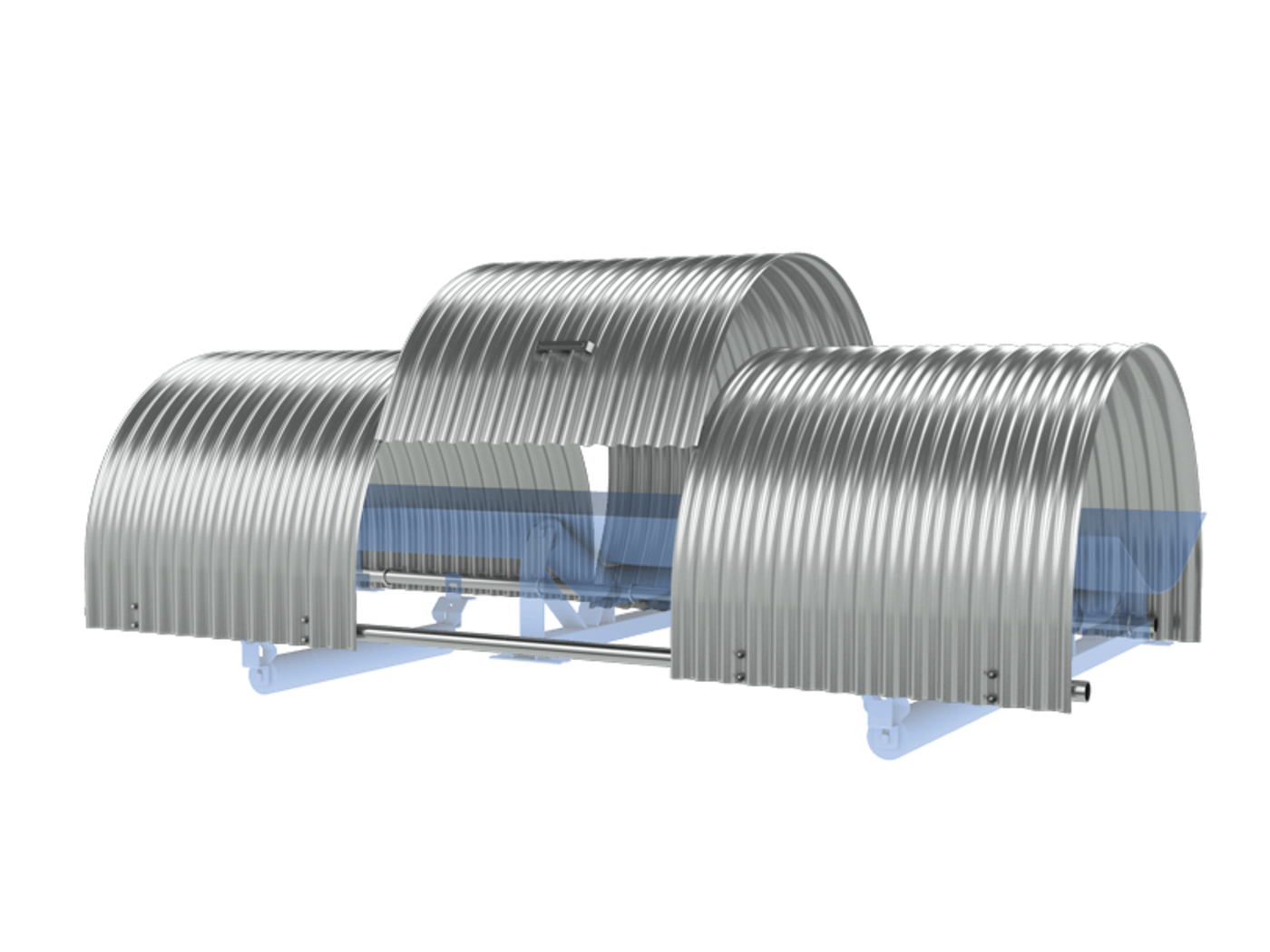 Unsere Öffnungsmöglichkeit TSC (Tube Swivel Cover) ist ausgelegt für bauseitige Rundrohr-Unterkonstruktionen. Die Hauben sind einseitig mit je zwei Rohrbügeln versehen, die scharnierartig wirken. Auf der Laufstegseite können die Hauben entweder mit einem kurzen, integrierten Spannband (ähnlich dem LOOP-System) befestigt werden oder in der einfacheren Variante mit einer Hakenschraube.