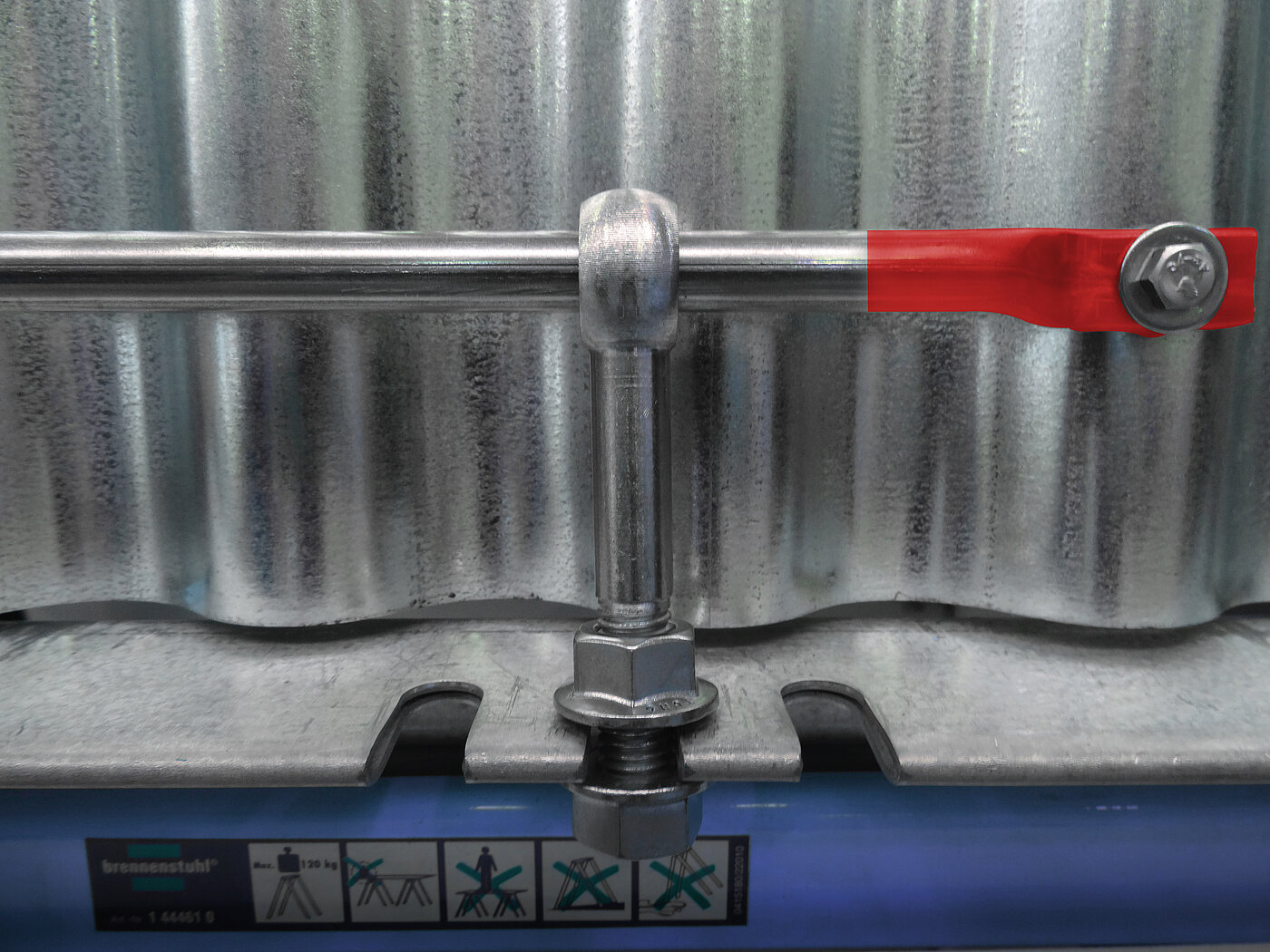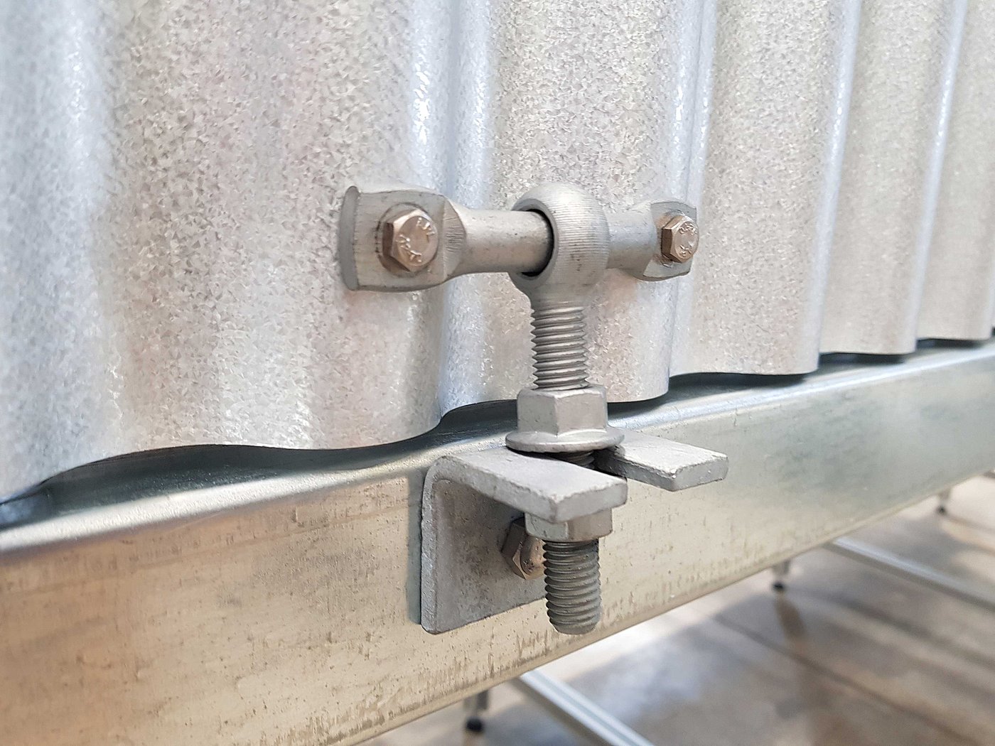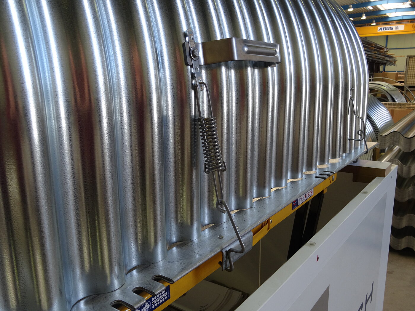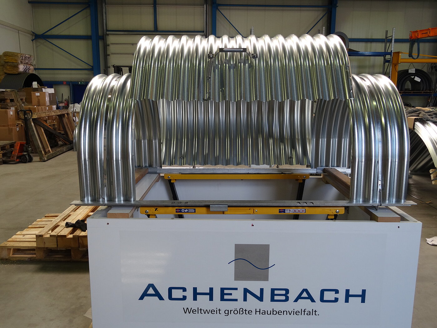 Die einfache Klapp-Haube von Achenbach verfügt über 4 verzinkte Scharnierbolzen und 4 kleine, verzinkte Winkel. So kann die Haube an jeder Stelle einfach auf dem vorhandenen Bandgerüst befestigt werden und benötigt i.d.R. keine separate Unterkonstruktion.