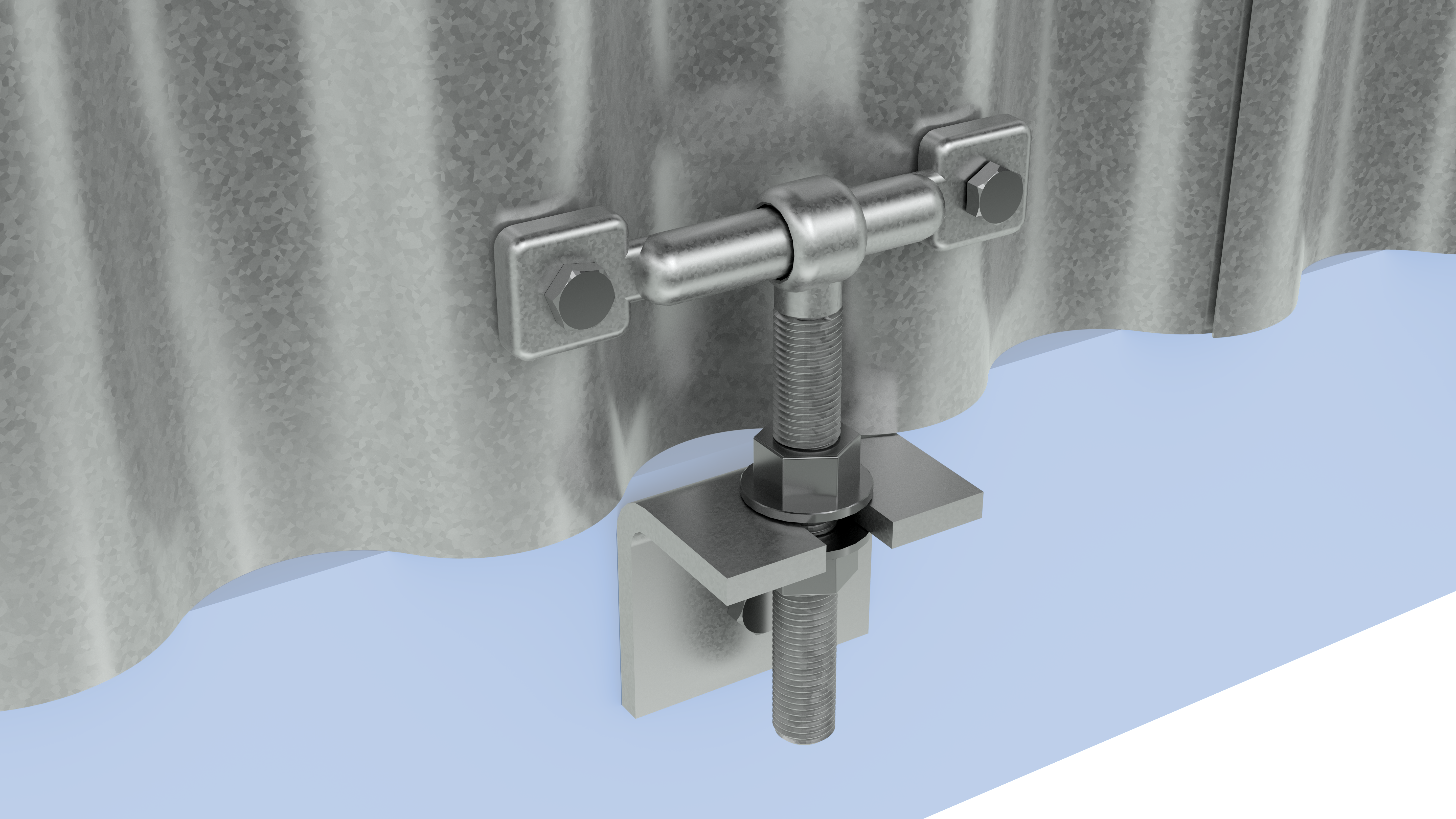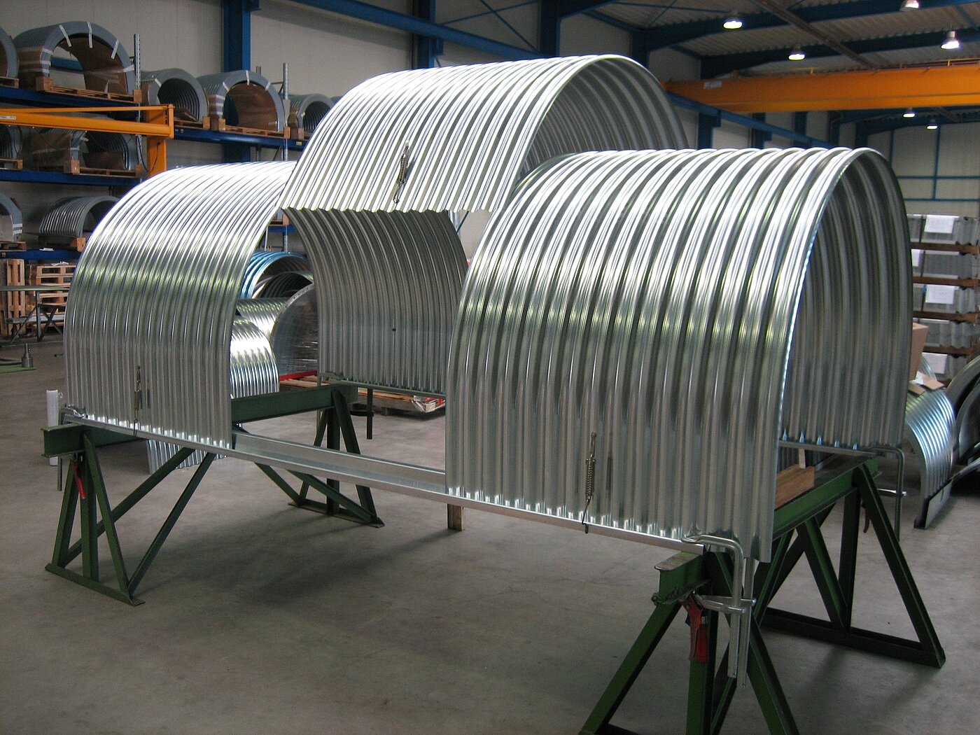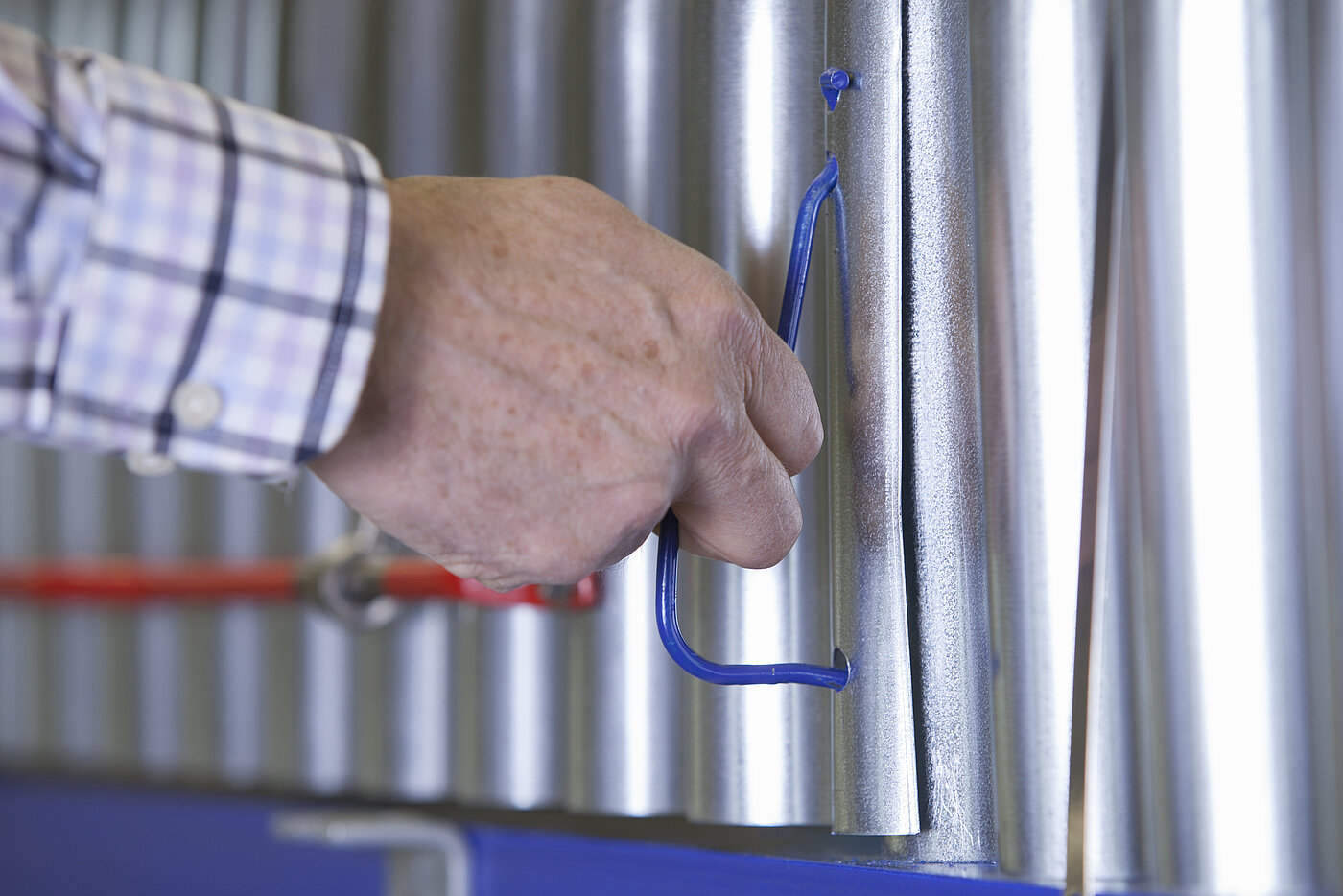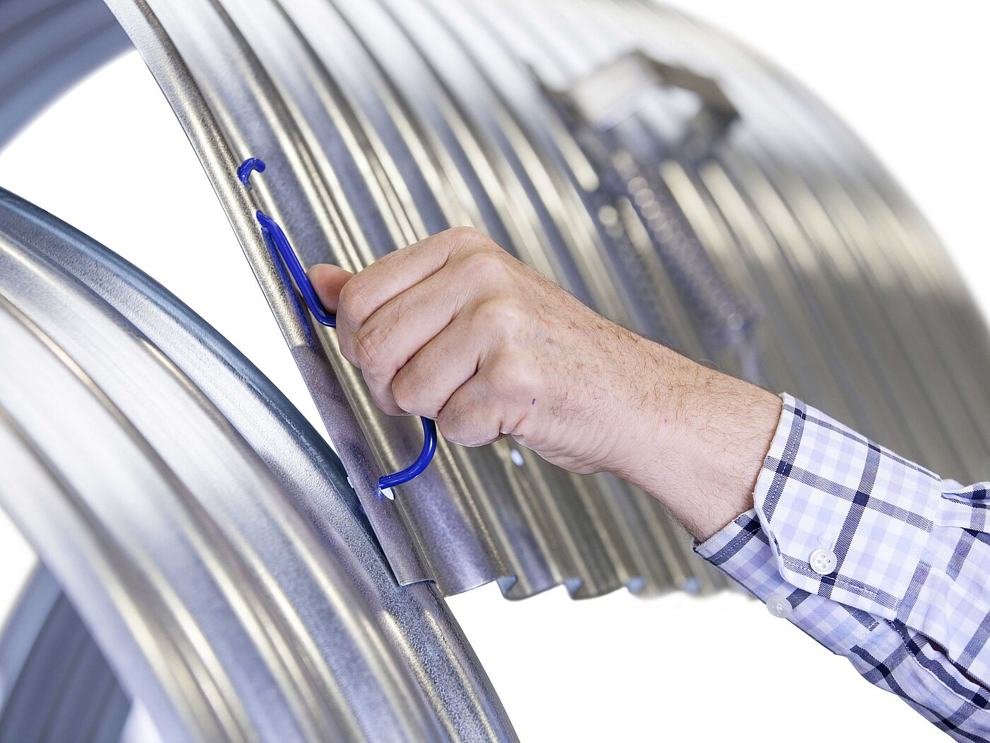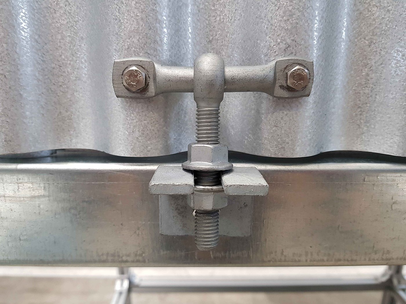 Die einfache Klapp-Haube von Achenbach verfügt über 4 verzinkte Scharnierbolzen und 4 kleine, verzinkte Winkel. So kann die Haube an jeder Stelle einfach auf dem vorhandenen Bandgerüst befestigt werden und benötigt i.d.R. keine separate Unterkonstruktion.